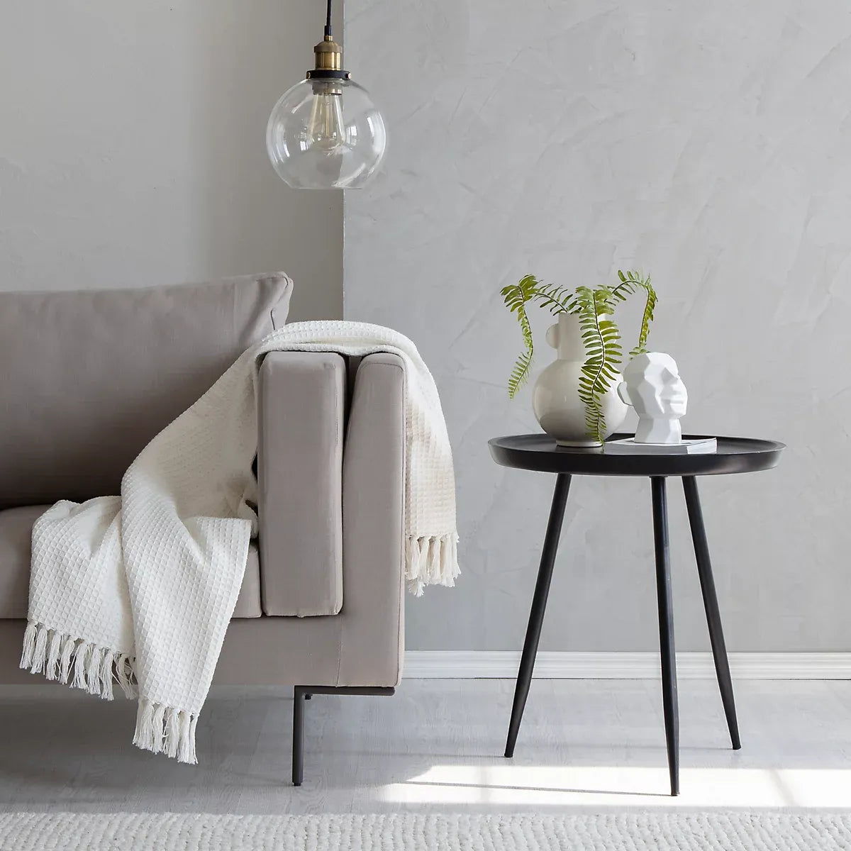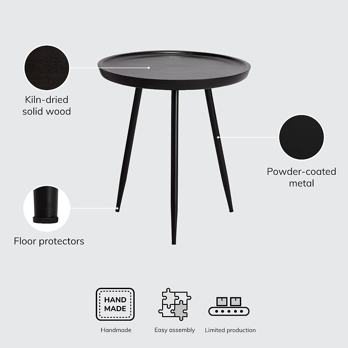 The Chervey round solid wood side table combines a mango wood top with black powder-coated metal legs. The top is 35 mm thick with a softly curved edge, mounted on curved legs for stability. This flat-pack table ships with assembly hardware and fittings included, and is designed for living rooms or bedrooms to hold a lamp, plant, or coffee. The top diameter is 532.5 mm, and the height is 585 mm. The table weighs 5.25 kg and includes floor protectors and a 1-month guarantee. Made in India, it features natural wood grain variations. Care: wipe clean with a dry cloth. Safety: tipover restraint device not included; no easy cable access; drop-tested before packing. Product code 5060519948014.