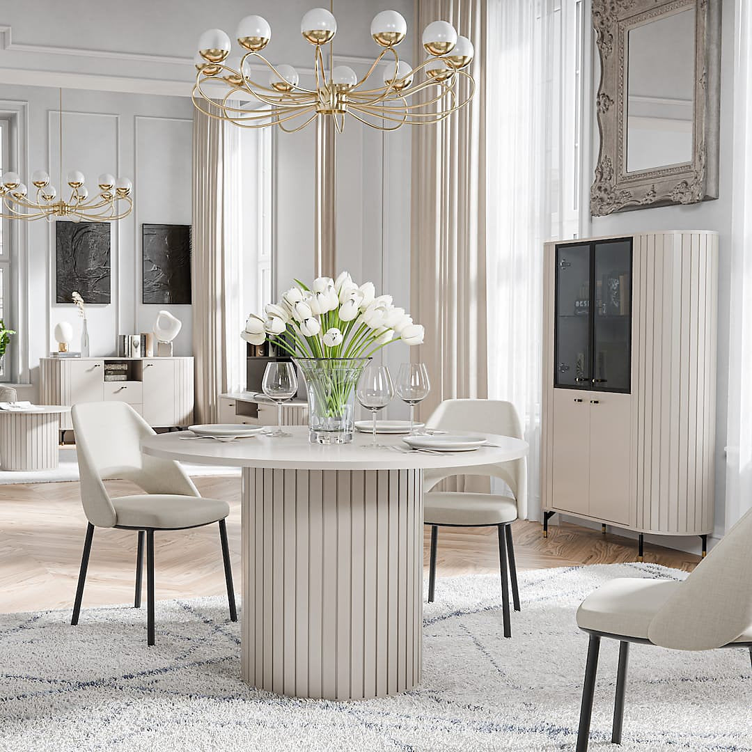 The Arte Elegant Cashmere Zante ZA8 Dining Table is a 120 cm square dining surface designed for modern living spaces. Built from 16 mm laminated board with MDF curved edges, it features a soft cashmere finish that adds warmth to a dining area. The table weighs 35 kg and includes fittings; a one-year guarantee is provided. Its compact footprint and rounded edges offer a balanced silhouette suitable for family meals or casual entertaining. The design supports multiple seating configurations and pairs with matching Arte furniture to create a cohesive dining room.