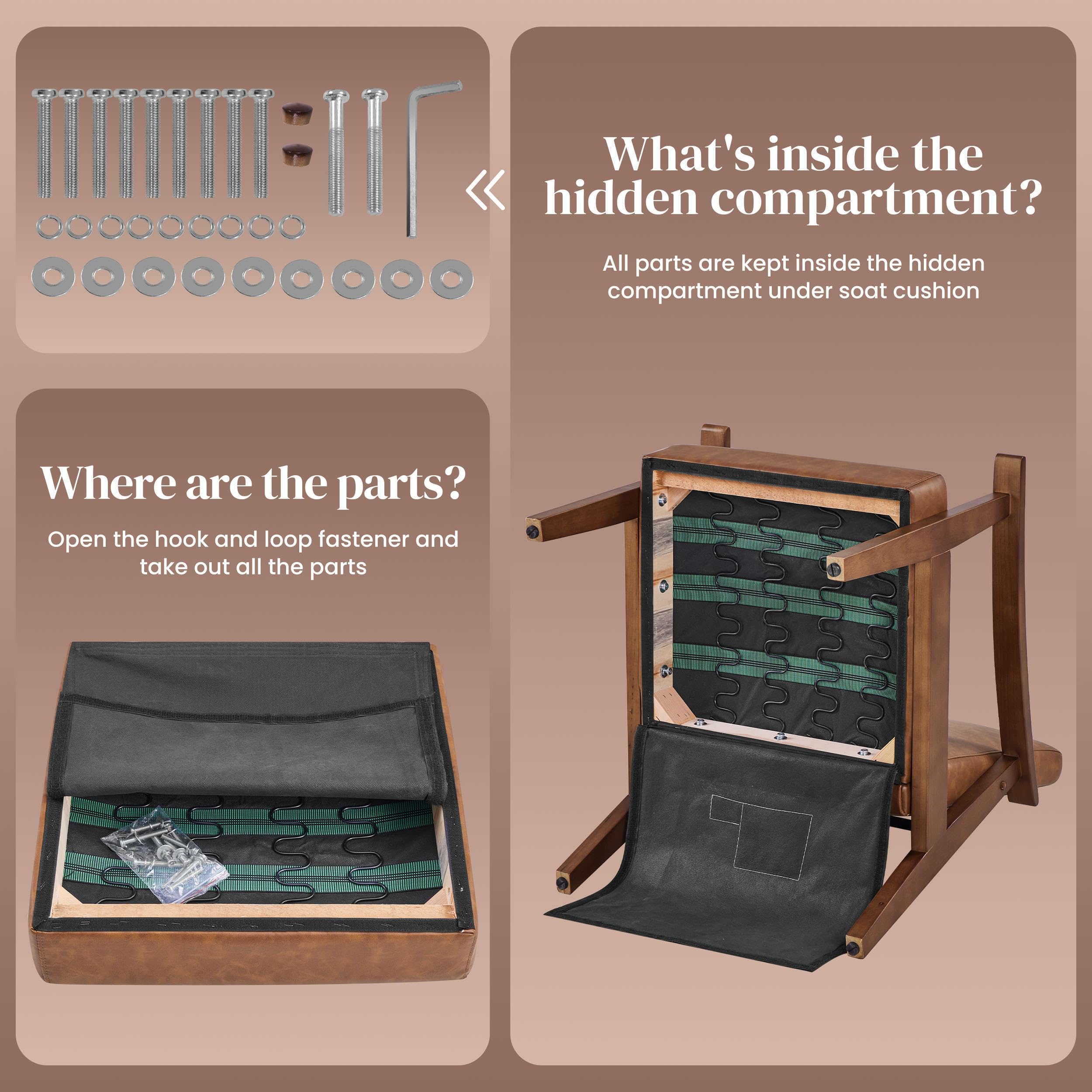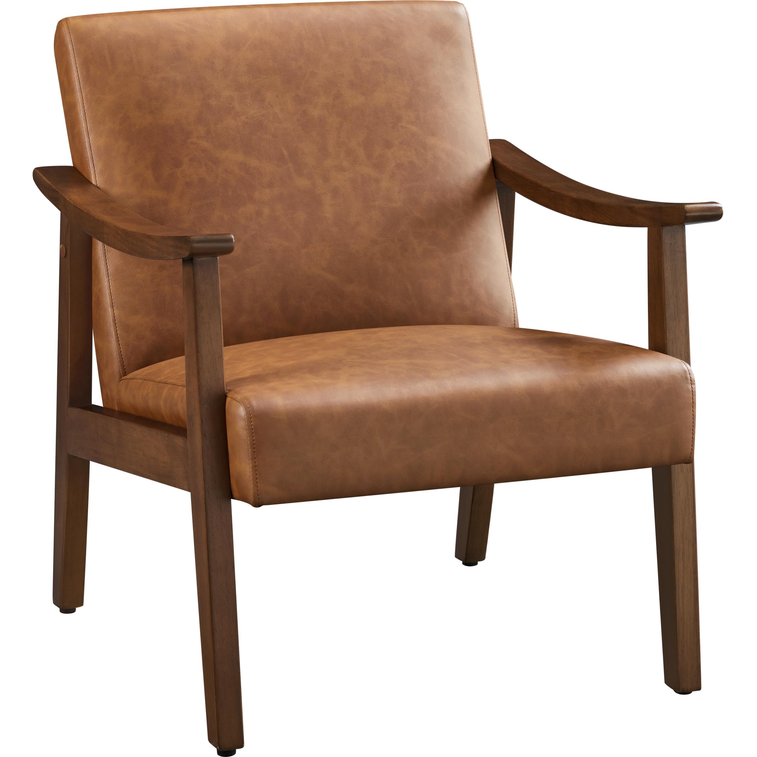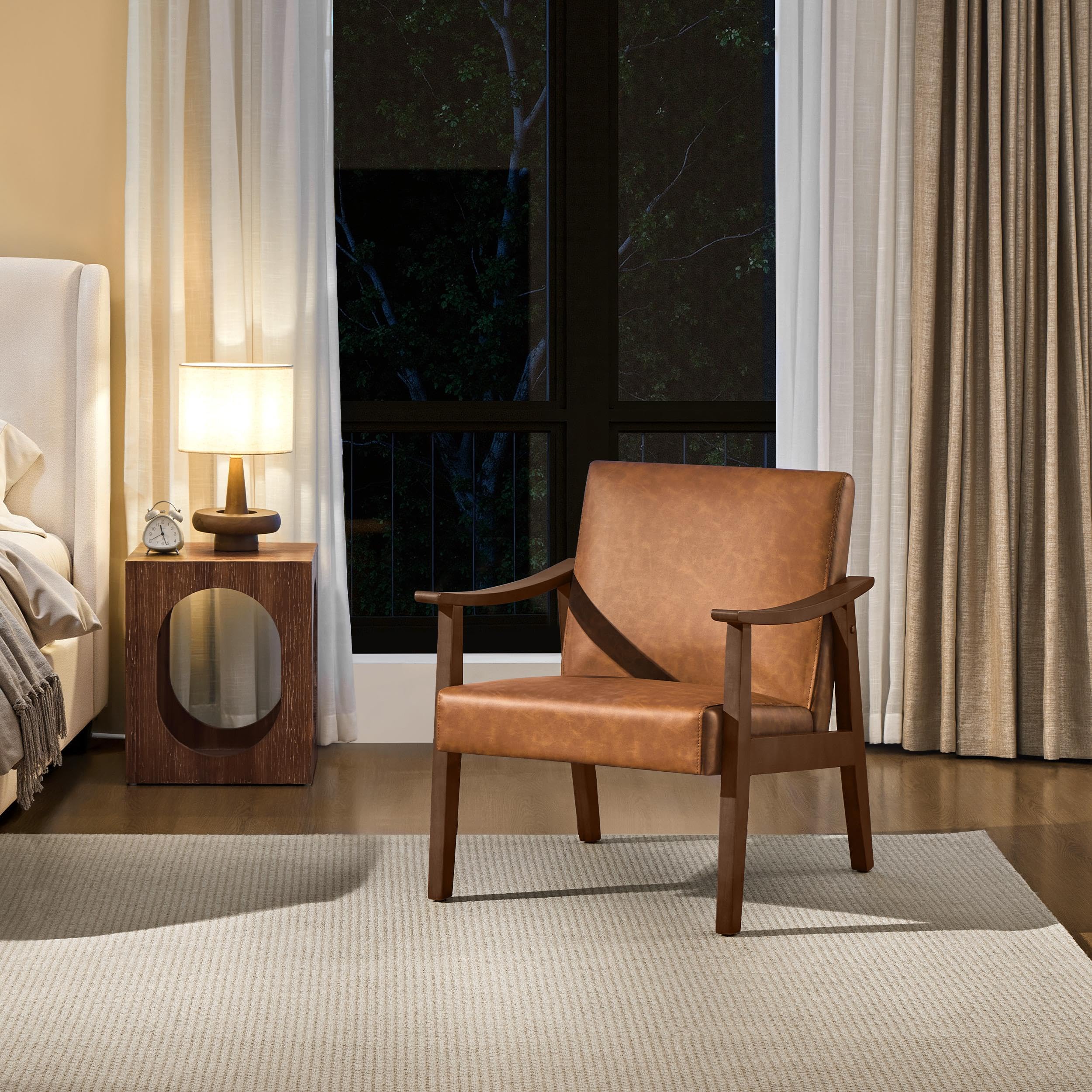 Yaheetech PU Leather Accent Chair in Brown combines a solid wood and manufactured wood frame with a cushioned artificial leather seat for lasting support. The splayed legs provide stability and a retro mid-century modern feel, while the low-profile seat and curved arms offer comfortable seating. The chair supports up to 300 lb and assembles easily with included hardware and illustrated instructions. The wood-tone side frame complements the brown upholstery for a warm, versatile addition to living rooms, bedrooms, waiting areas, or offices.